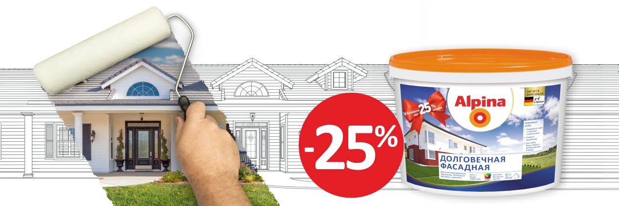 В честь 25-летия производства краски Alpina в Беларуси мы дарим вам отличную возможность преобразить свой дом – краска Alpina Долговечная фасадная со скидкой 25%!